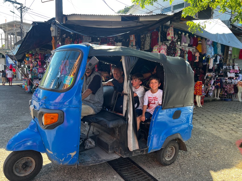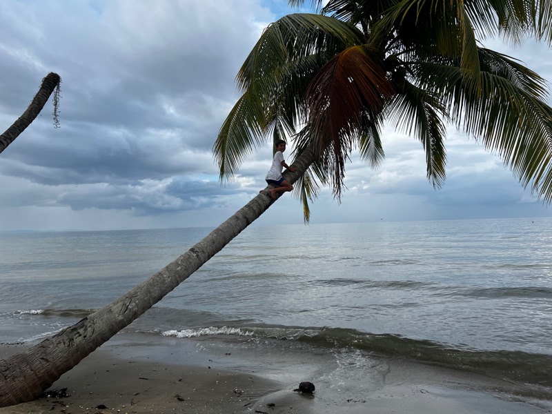 We get a tuk-tuk to the local beach where we are going to take a walk to the waterfall. The beach should be beautiful, lined with mangrove and coconut palms and It’s initially not too bad, but a few hundred metres up, we are walking on a bed of plastic washed up on the shore. We even spot an entire trainer with its own ecosystem, filled with crabs and all kinds of sea creatures. We didn’t make it to the waterfall as it really wasn’t the greatest of walks 😳, but instead we find some local boys playing football on the beach and Seb enjoys a great little match with them.
