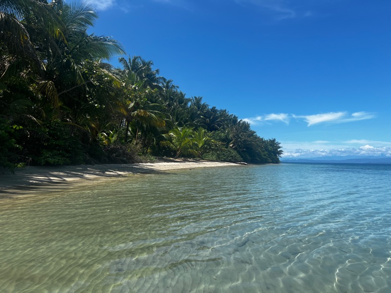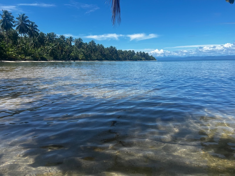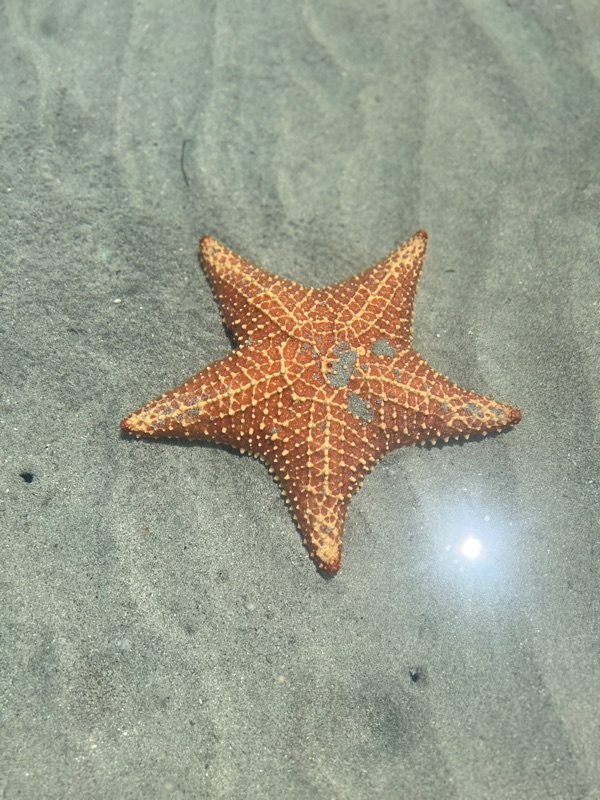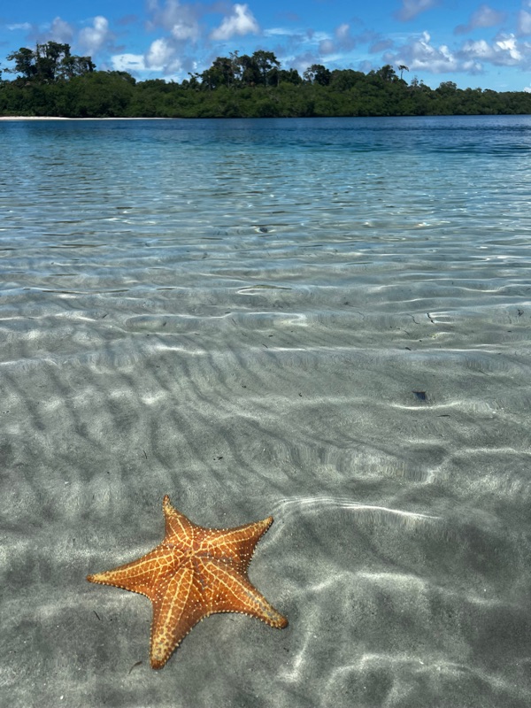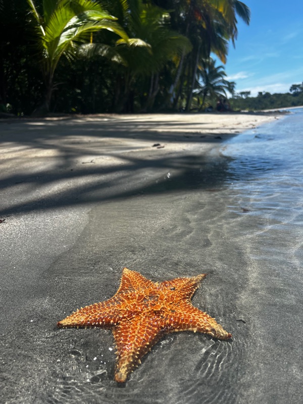Our first day was in an area called Bocas del Drago, to a beach called Playa Estrella, named because of the hundreds of starfish in this area. As cheapskate backpackers, we decided not to take the $6 water taxi to the beach, instead enjoying a slow meander along the beach (this also avoided the BF American tourists crammed on the water taxis taking pictures from the comfort of their seats). Boy-oh-boy what a good decision this was as the walk was incredible…a palm-lined / jungle beach, with pristine white sand, crystal clear warm azul blue waters with hundreds of colourful starfish, fish and rays just a metre from the shore. We also had a glimpse of a pod of bottle-nosed dolphins swimming about 100 metres out in the lagoon.