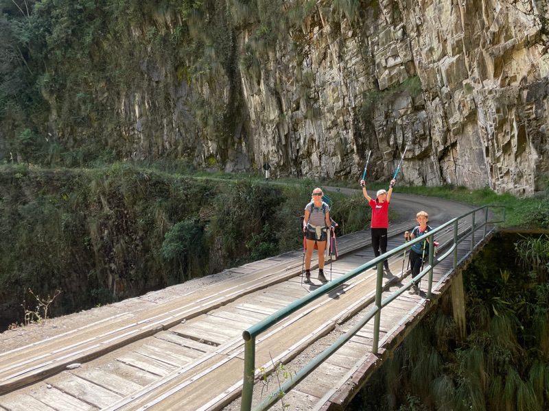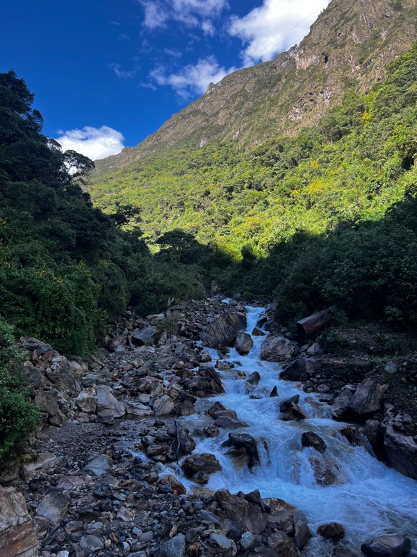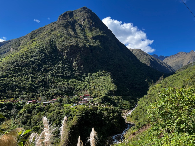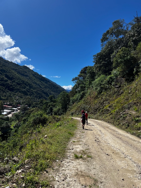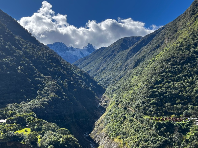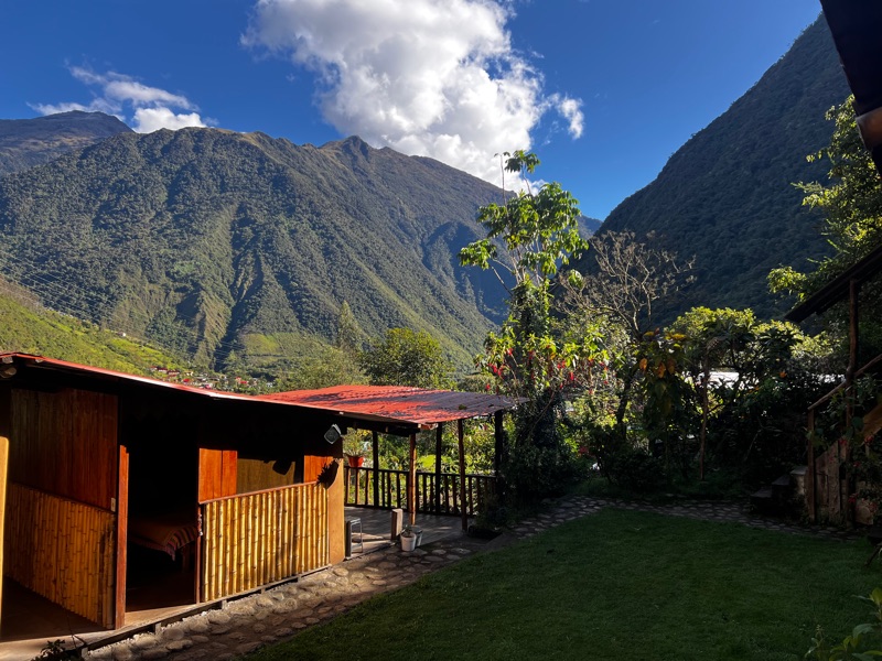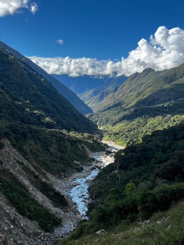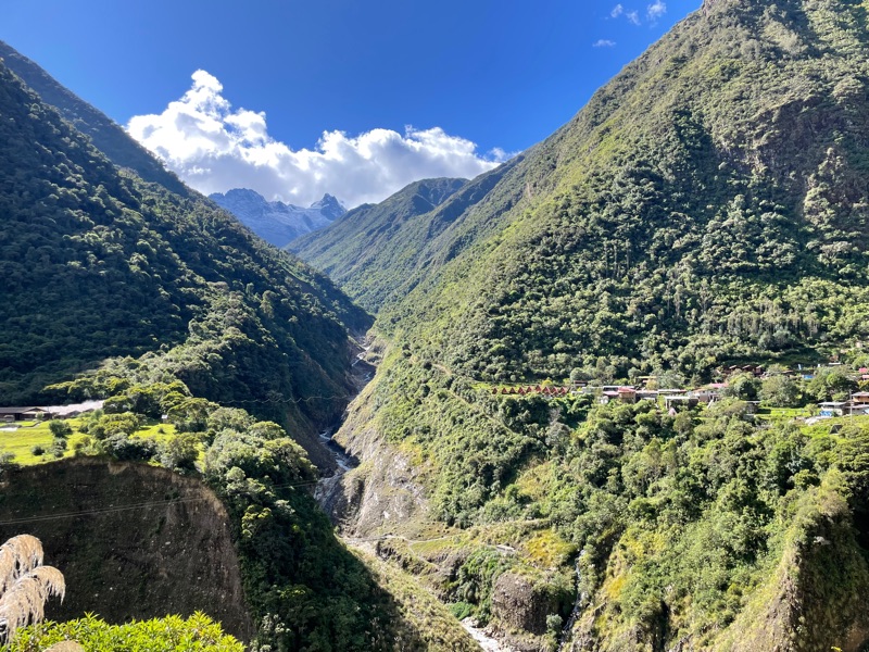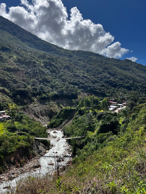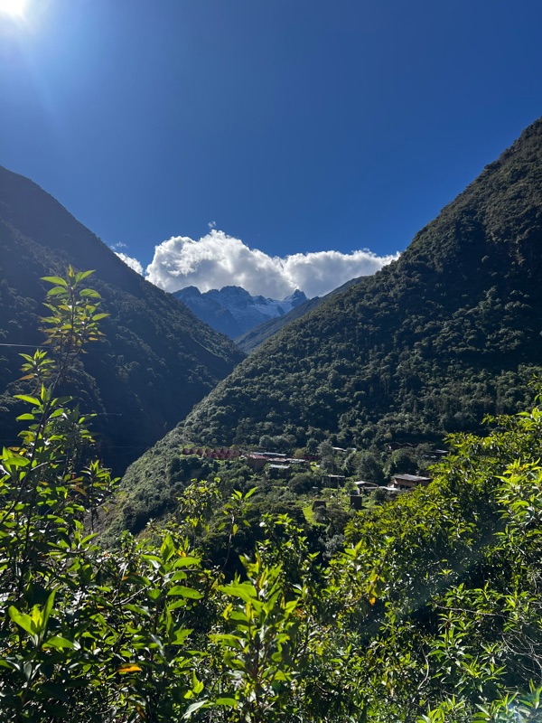 We begin the walk through little villages and then we walk alongside a spectacular cliff-edge riverside path with incredible jungle-filled mountains (huge granite karsts) all around us. As we get further towards Lucmabamba, the jungle changes to little fincas growing coffee, avocado, cocoa, banana etc and it is truly a little paradise within the mountains.