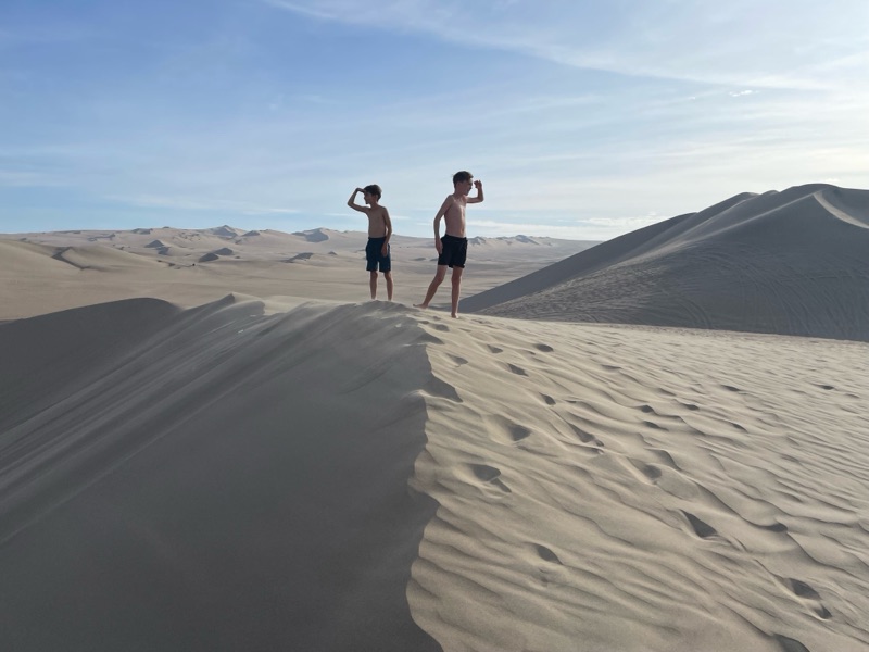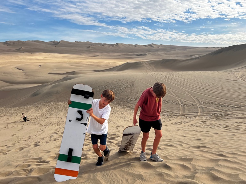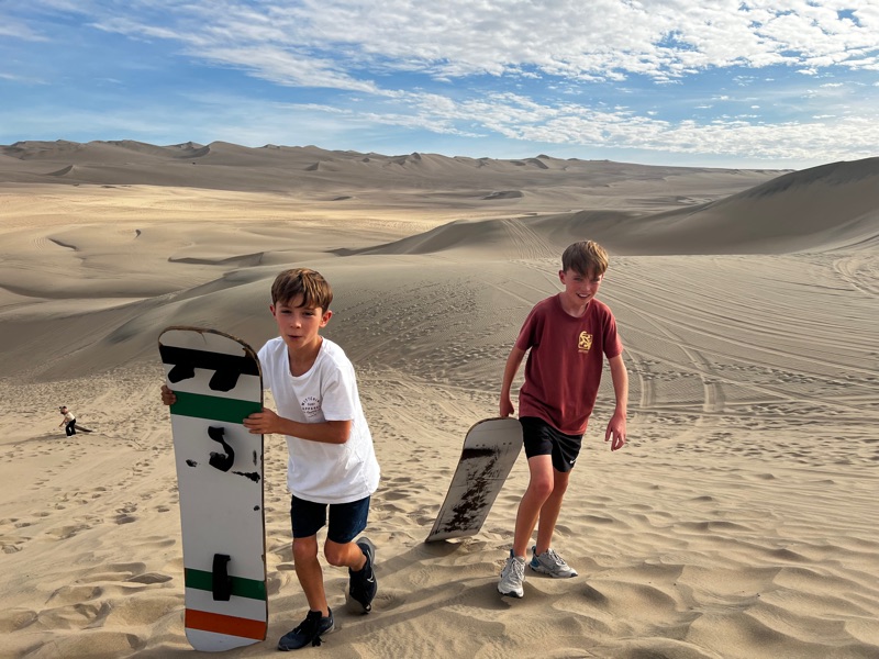 Next stop - the sand boarding….To say that it was a touch scary is an understatement! Filled with dread watching our beloved children plunge down a 100 metre dune with above a 45deg drop! We reckoned we were doing over 30mph at the bottom! Of course both parents had to follow behind them. We hope the photos do it justice!